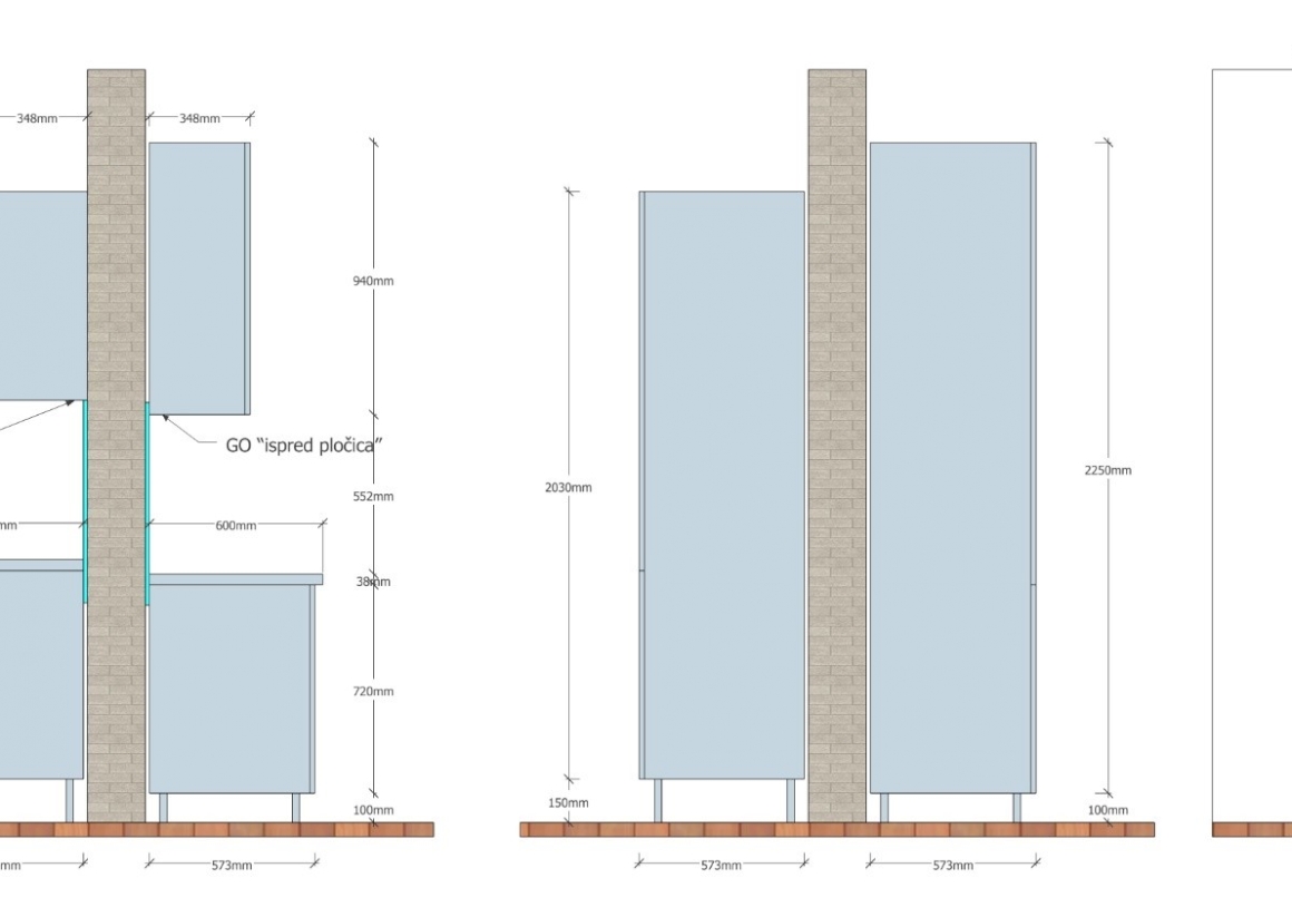 Izmjerite zidove, ručno nacrtajte skicu i na svakom zidu označite gdje vam se nalaze koji priključci. Ukoliko u prostoru postoje bilo kakve prepreke molimo da to također označite (dimnjak, stupovi i sl.) Navedite jeste li mjerenje napravili od pločica do pločica ili od zida do zida. Ako planirate kuhinju u novome prostoru gdje još nisu napravljene instalacije ili instalacije planirate raditi kada bude gotov projekt kuhinje, tada su nam dimenzije zidova i prozora dovoljne da krenemo u osmišljavanje vaše nove kuhinje.