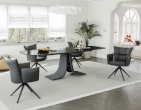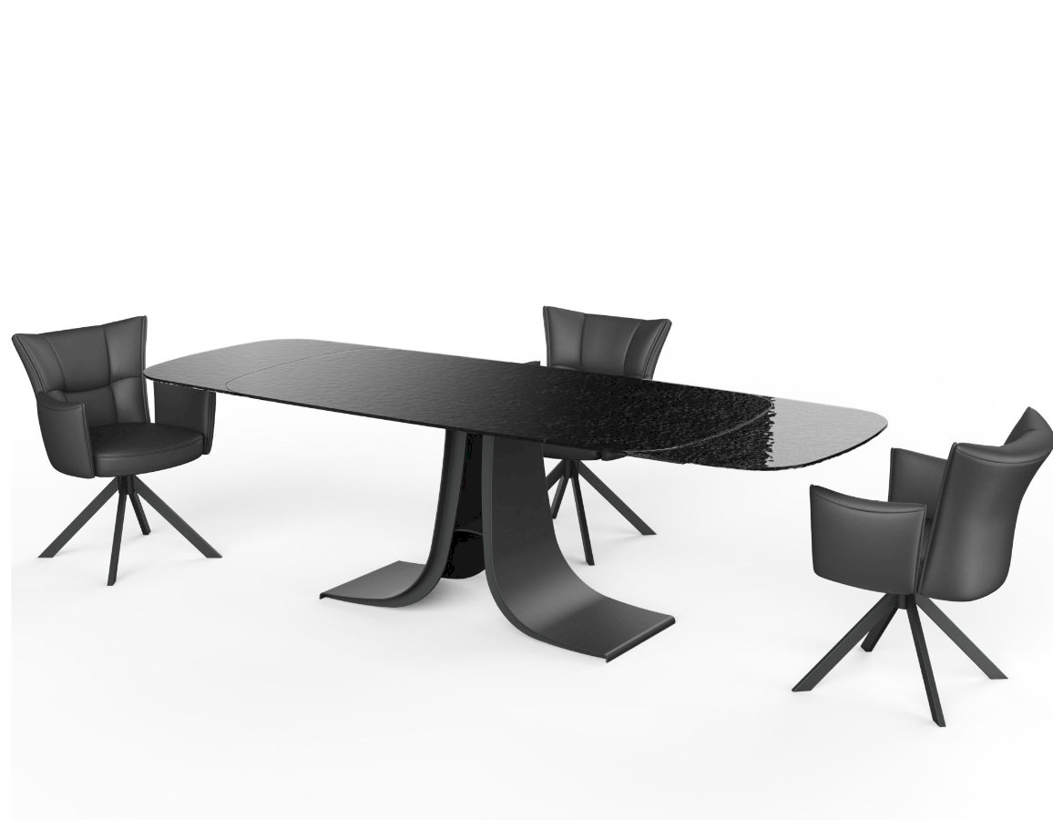 Moderan stol na razvlačenje u crnoj boji koji će odlično izgledati u vašoj blagovaonici. Ploča stola izrađena je od stakla, s ugodno zaobljenim kutovima za mekši izgled. Ploča stola ima dva produžetka od 40 cm koji se izvlače iz bočnih stranica stola i rastežu korisnu površinu ploče od 180x95 cm do 260x95 cm. Metalna baza stola, izrađena od zakrivljenih ploča u odgovarajućoj crnoj boji, premazana je prahom za bolju zaštitu okoliša.