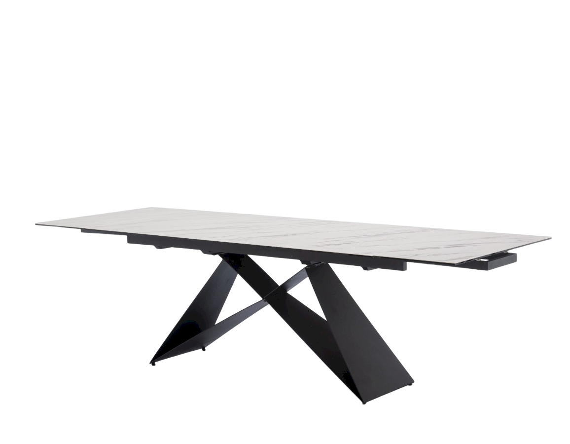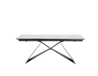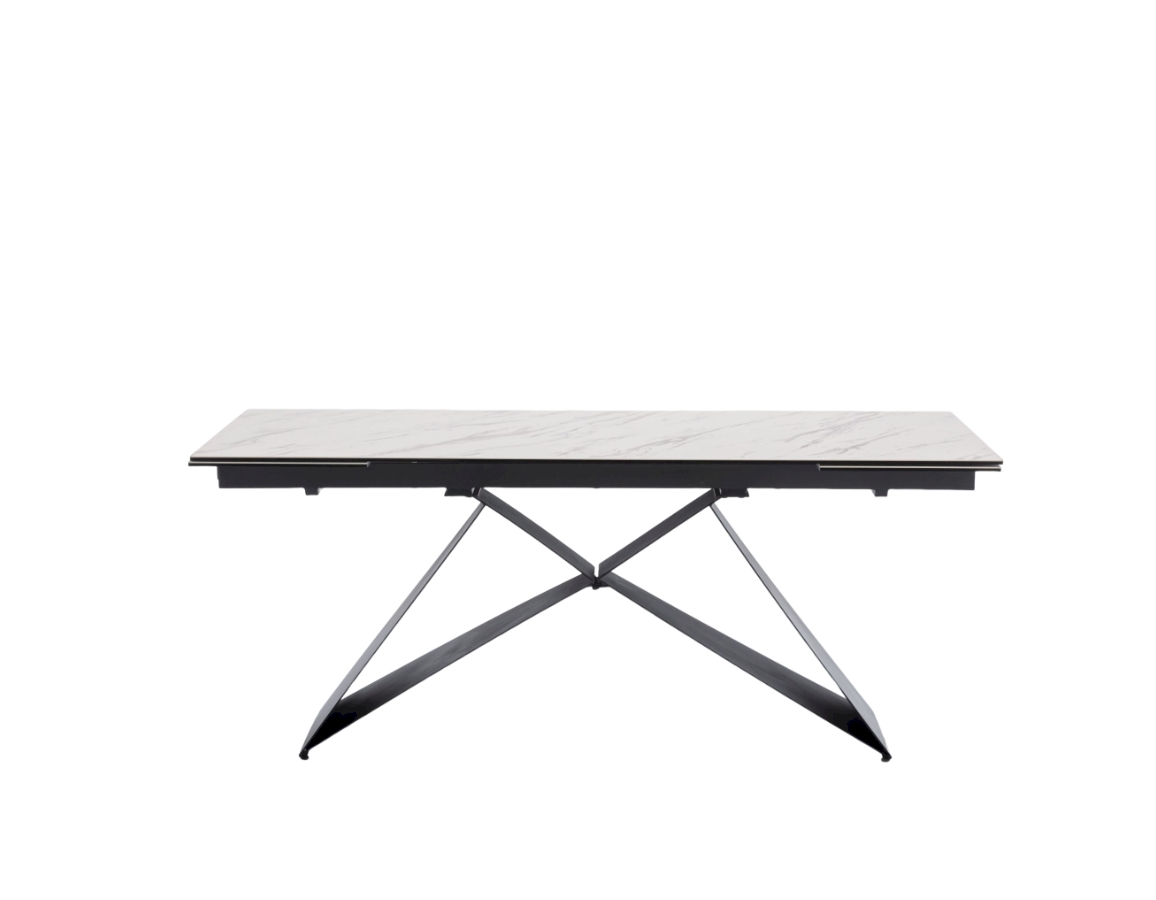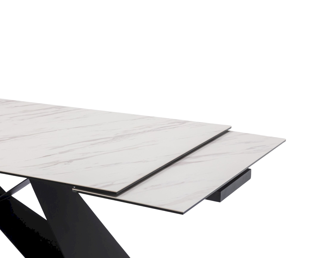Ploča stola ima ravne rubove i izrađena je od kaljenog stakla debljine 8 mm, presvučenog slojem keramike debljine 3 mm. Ova kombinacija keramičke površine i podloge od kaljenog stakla objedinjuje prednosti oba materijala, osiguravajući visoku otpornost na toplinsko širenje i ogrebotine te neporoznu površinu koja omogućuje jednostavno i lako čišćenje. Stol je opremljen s dva produžetka duljine 40 cm, koji se jednostavnim mehanizmom izvlače sa strane stola. Duljina ploče može se povećati s 180 cm na maksimalnih 260 cm. Baza stola izrađena je od metalnih ploča debljine 4,5 mm i praškasto je obojena radi dodatne zaštite.