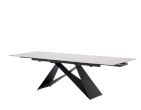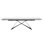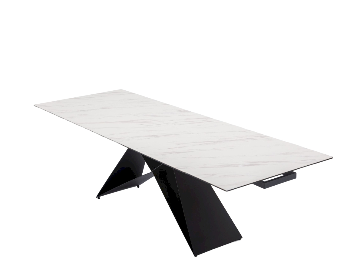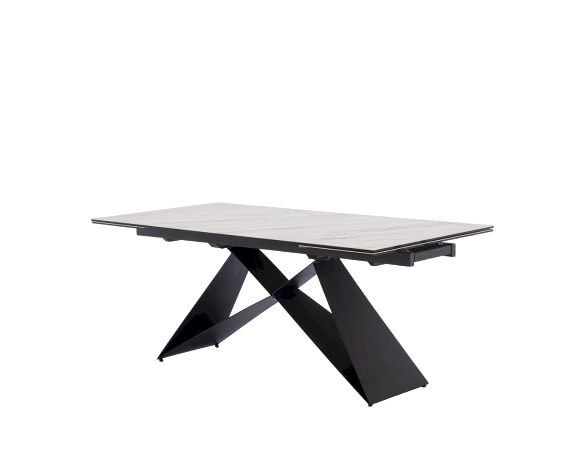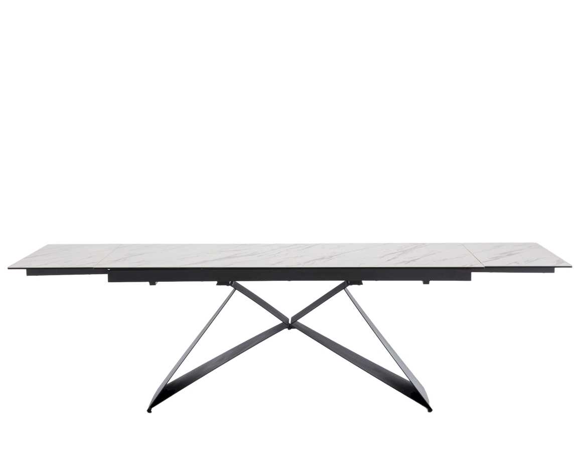 Ploča stola ima ravne rubove i izrađena je od kaljenog stakla debljine 8 mm, presvučenog slojem keramike debljine 3 mm. Ova kombinacija keramičke površine i podloge od kaljenog stakla objedinjuje prednosti oba materijala, osiguravajući visoku otpornost na toplinsko širenje i ogrebotine te neporoznu površinu koja omogućuje jednostavno i lako čišćenje. Stol je opremljen s dva produžetka duljine 40 cm, koji se jednostavnim mehanizmom izvlače sa strane stola. Duljina ploče može se povećati s 180 cm na maksimalnih 260 cm. Baza stola izrađena je od metalnih ploča debljine 4,5 mm i praškasto je obojena radi dodatne zaštite.
