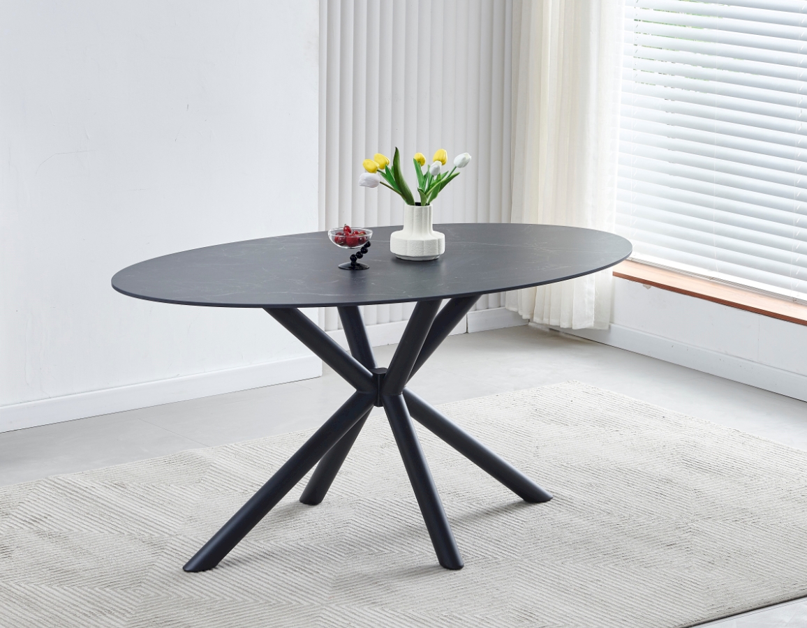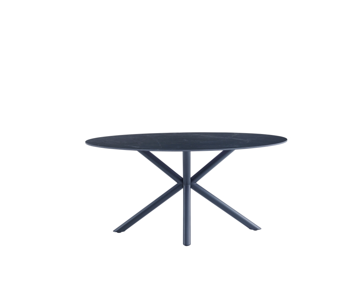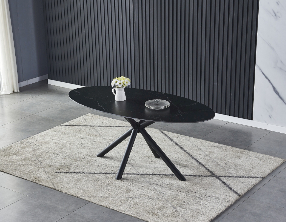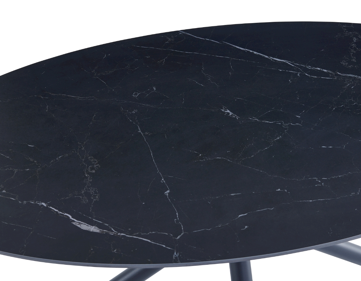 Blagovaonski stol u mat crnoj boji s elegantnim mramornim uzorkom. Ovalna ploča stola u potpunosti je izrađena od sinteriranog kamena debljine 12 mm. Sinterirani kamen dobiva se kombinacijom prirodnog kamena različitih boja te ima niz prednosti u odnosu na klasičnu keramiku. Čvršći je od velikih keramičkih ploča i manje sklon lomljenju. U usporedbi s prirodnim granitnim pločama, prirodno je vodootporan. Osim toga, ekološki je prihvatljiviji od kemijski obrađenih kvarcnih ploča.
