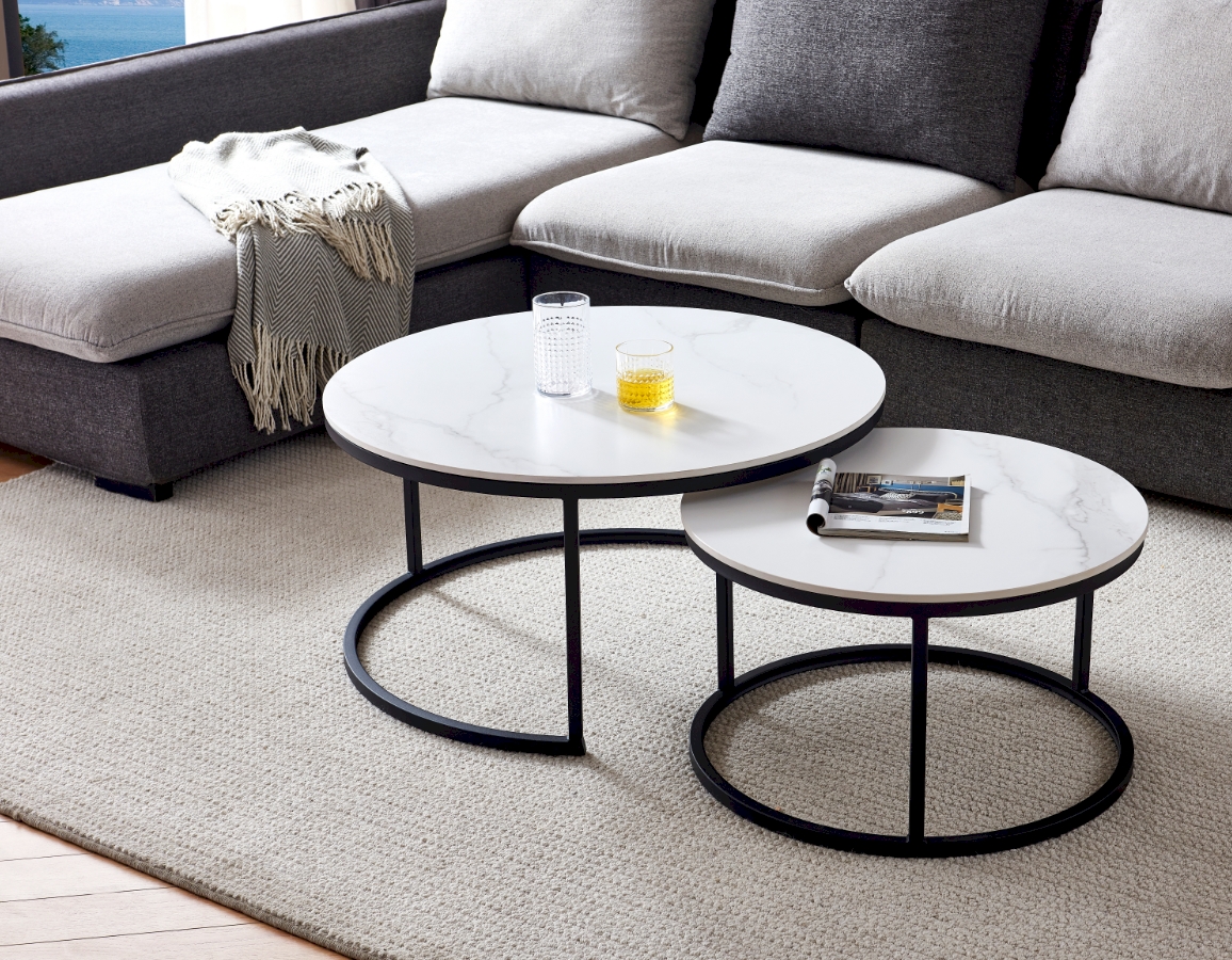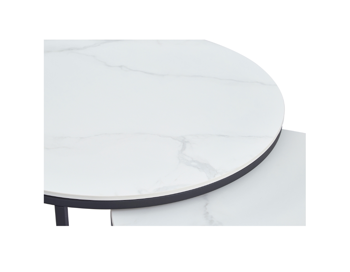 Set od dva okrugla stolića. Ploče stolova izrađene su od sinteriranog kamena s prekrasnim mramornim uzorkom i debljine su 1,2 cm.