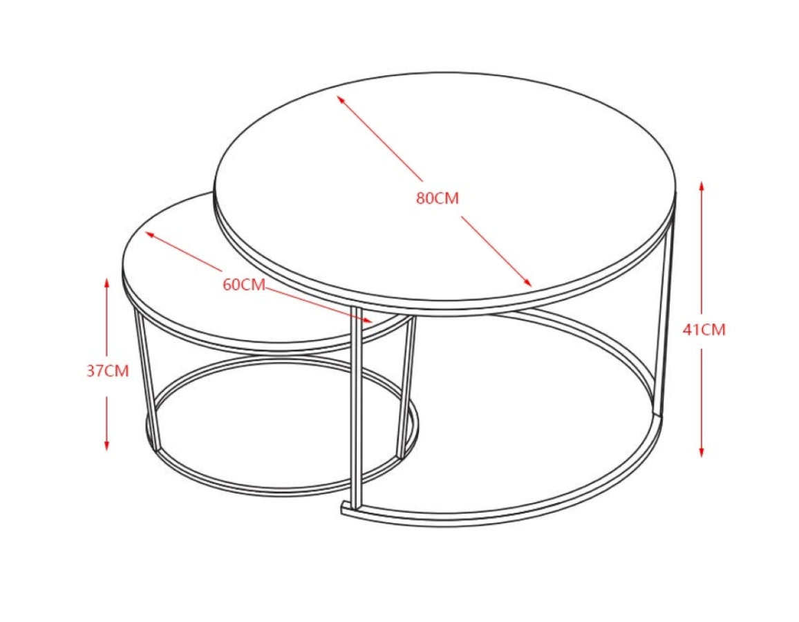 Veći stol je visok 41 cm i ima promjer 80 cm, dok je manji stol visok 37 cm i ima promjer 60 cm.
