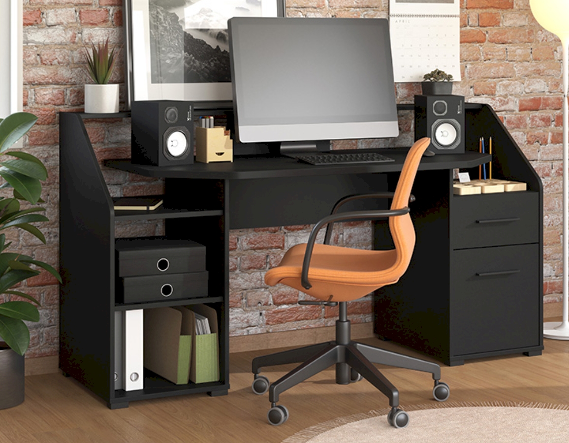 Radni stol BLETCHLEY u crnoj boji idealno je rješenje za opremanje radnog kutka, jer osim izuzetno atraktivne estetike, ima i izraženu funkcionalnost. Praktično postavljene otvorene i zatvorene police, kao i jedna ladica, pružaju obilje prostora za pohranu, dok radna površina ističe udobnost i daje dovoljno prostora za rad.